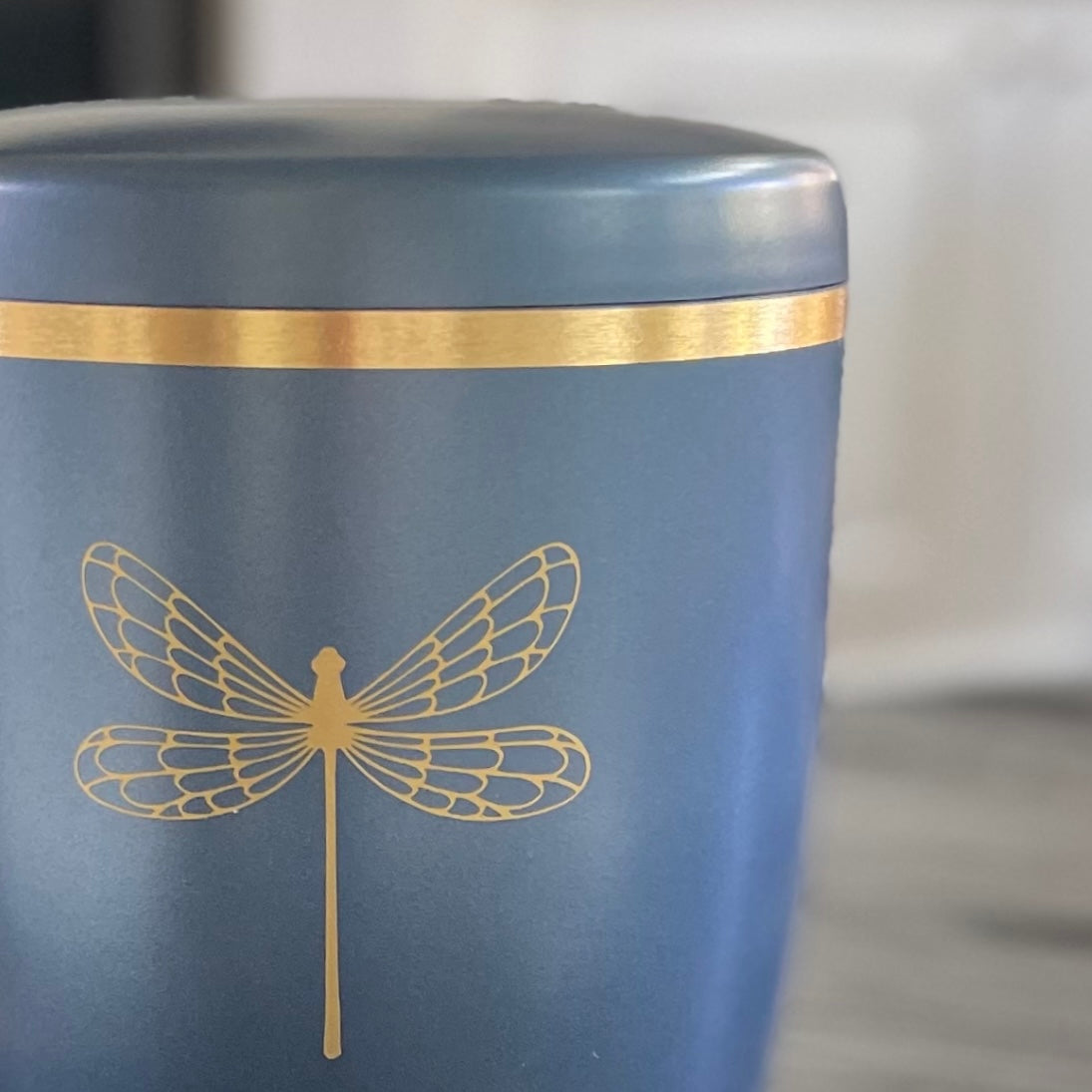 Beautiful soft blue funeral urn for ashes with a delicate golden dragonfly. The colour of this urn is reminiscent of a place where the earth meets the sky, a sublime place between heaven and earth; the dragonfly is a symbol of love and hope. This simple style and beautiful colour suits a wide variety of personal styles and flower arrangements.
