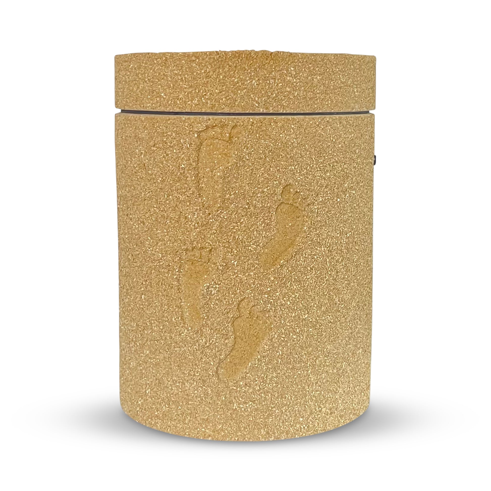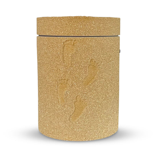 Beautiful hand-crafted sand urn with foot prints. This urn is a heartfelt vessel for someone who loved the beach and our beautiful oceans. Sand and the imprints of footsteps are not only symbols of the passing of time, but also of strength and a free spirit. Our Footprint in the Sand urn will hold a loved one's ashes with love. At a celebration of life or memorial service, this urn lends itself perfectly to be decorated in many personal ways.