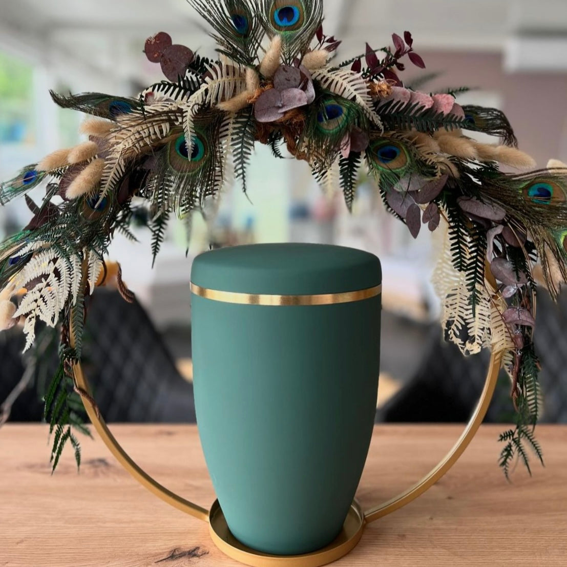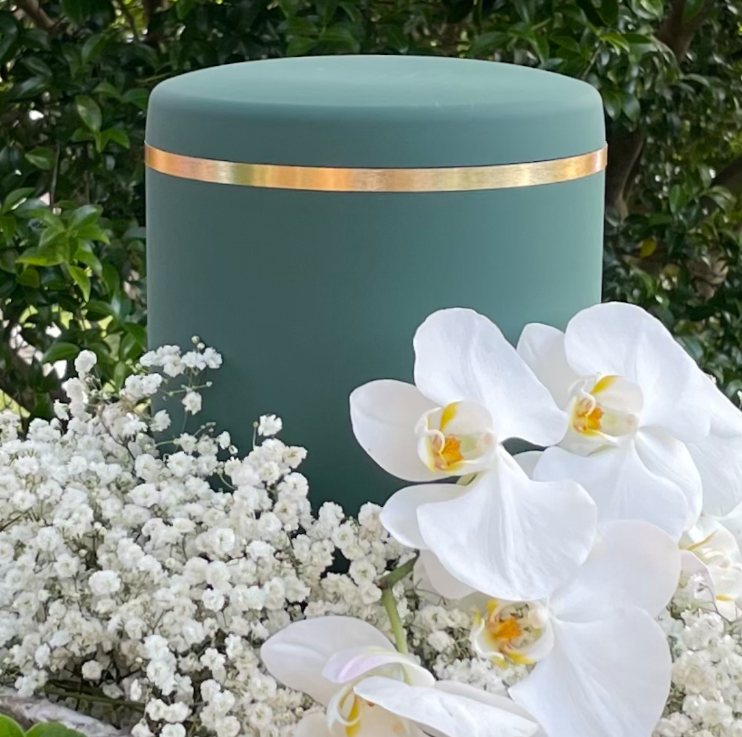 Beautiful sage coloured urn for ashes with a delicate brushed gold band. The colour sage is associated with harmony and nature. It represents renewal, spring and rebirth. The beautiful colour and simple and elegant design of this urn suits a wide variety of personal styles and flower arrangements. We love this urn with white roses, lilies, orchids, jasmine, daisies or tuberose and delicate greenery.