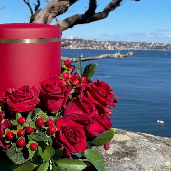 Beautiful ruby coloured urn for ashes with a delicate brushed gold band. This urn is classic and contemporary at the same time. Red is the colour of love and devotion, and this urn is a beautiful and heartfelt gesture. The delicate gold band adorning the urn represents love’s eternal and never ending quality. This simple and elegant funeral urn suits a wide variety of personal styles and flower arrangements. We think this urn is most beautiful with red roses, carnations, Australian Bottle Brush or poppies and fresh foliage.